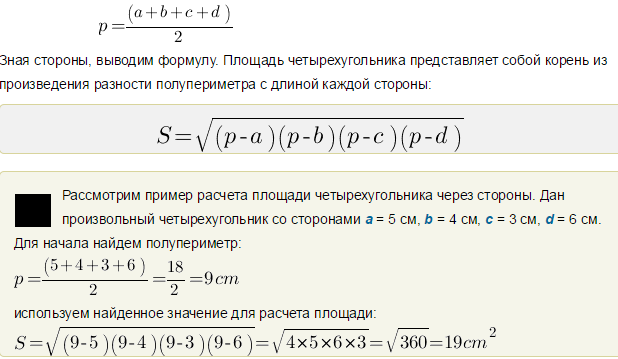 Чтоб найти площадь четырехугольника надо первую сторону умножить на вторую. Если все разные , воспользуйтесь формулами(они на картинке)