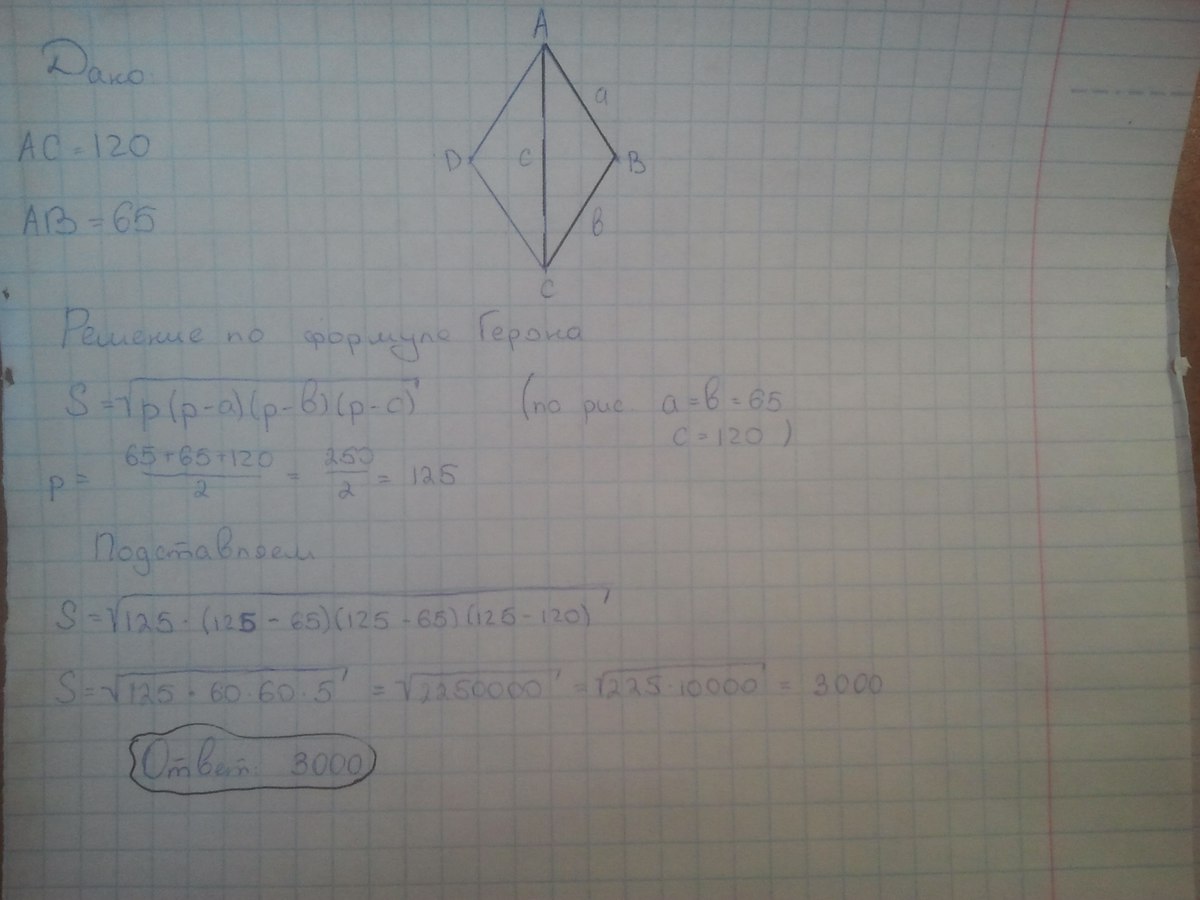 , следовательно вторая диагональ равна 50см, а площадь равна (120*50)/2=3000 кв.см.