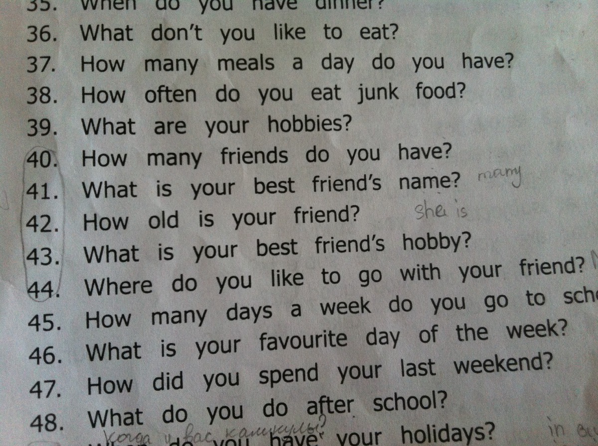 40. I have ten friends. 41. His(her) name Sasha.42. he (her) have (сколько нужно) old.43.His(her) hobby is dance.44.i like to go to the cinema.49.I have a vacation in the winter, spring, autumn and summer.50.Go to the sea.51.We can swim