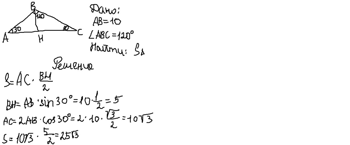 Помогите с задаче ребят : В равнобедренном треугольнике боковая сторона равна 10, а угол ,лежащий напротив основания ,равен 120 градусов . Найдите площадь треугольника