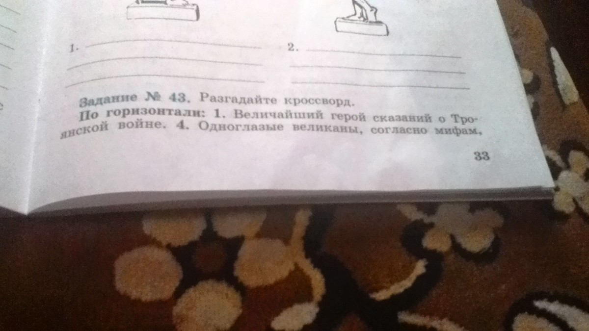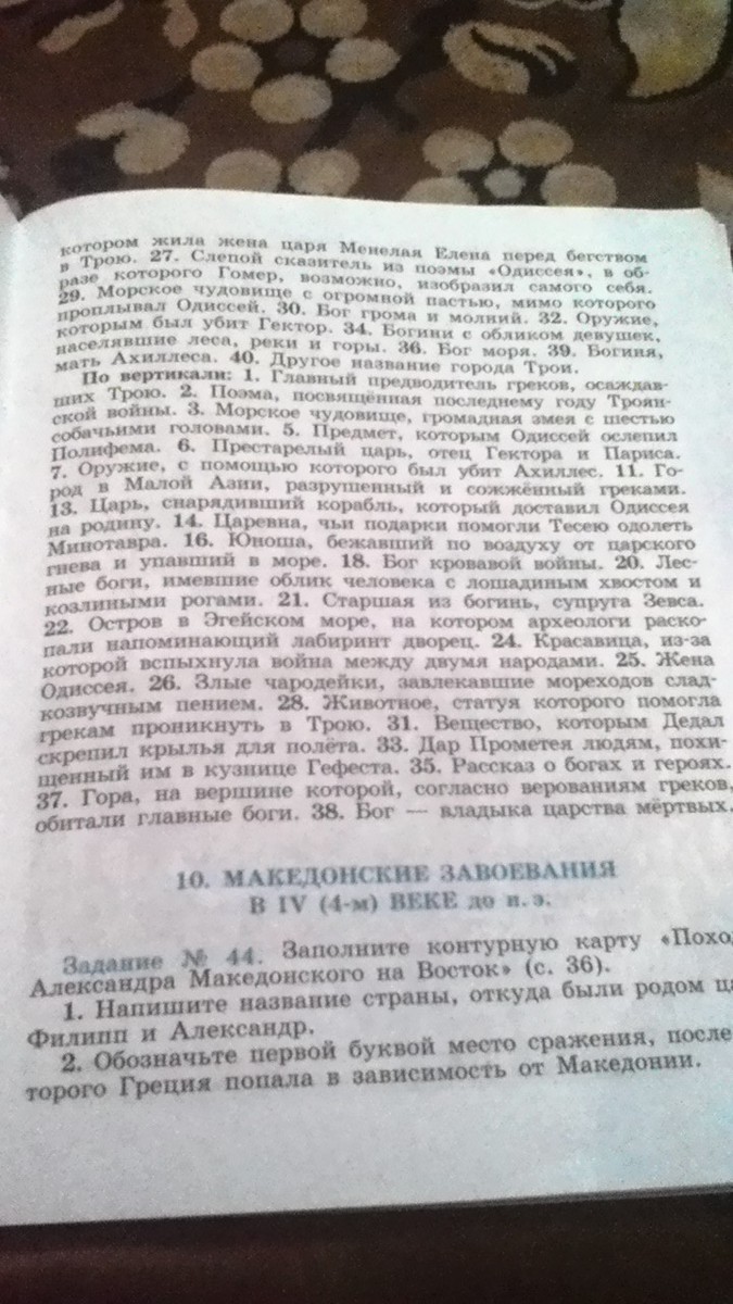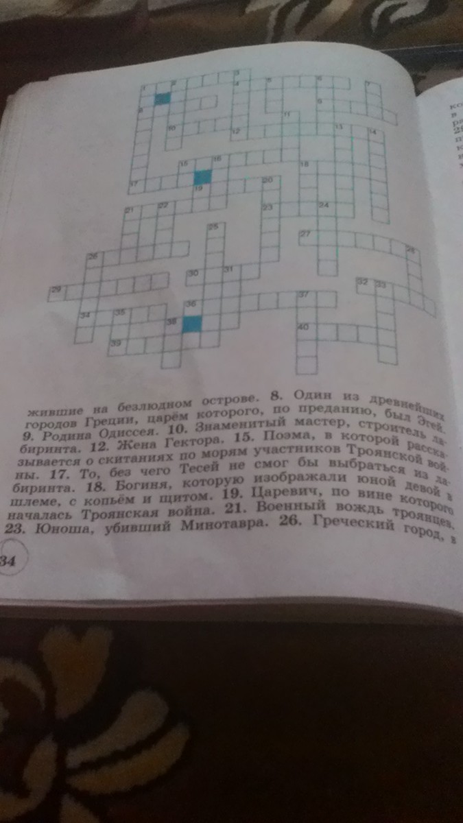 По горизонтали: 1. Величайший герой сказаний о Троянской войне (Ахиллес). 4. Одноглазые великаны, согласно мифам, жившие на безлюдном острове (циклопы). 8. Один из древнейших городов Греции, царем которого, по преданию, был Эгей (Афины). 9. Родина Одиссея (Итака). 10. Знаменитый мастер, строитель лабиринта (Дедал). 12. Жена Гектора (Андромаха). 15. Поэма, в которой рассказывается о скитаниях по морям участников Троянской войны (Одиссея). 17. То, без чего Тесей не смог бы выбраться из лабиринта (нить). 18. Богиня, которую изображали юной девой в шлеме, с копьем и щитом (Афина). 19. Царевич, по вине которого началась Троянская война (Парис). 21. Военный вождь троянцев (Гектор). 23. Юноша, убивший Минотавра (Тесей). 26. Греческий город, в котором жила жена царя Менелая Елена перед бегством в Трою (Спарта). 27. Слепой сказитель из поэмы «Одиссея», в образе которого Гомер, возможно, изобразил самого себя (Демодок). 29. Морское чудовище с огромной пастью, мимо которого проплывал Одиссей (Харибда). 30. Бог грома и молний (Зевс). 32. Оружие, которым был убит Гектор (копье). 34. Богини с обликом девушек, населявшие леса, реки и горы (нимфы). 36. Бог моря (Посейдон). 39. Богиня, мать Ахиллеса (Фетида). 40. Другое название города Трои (Илион)