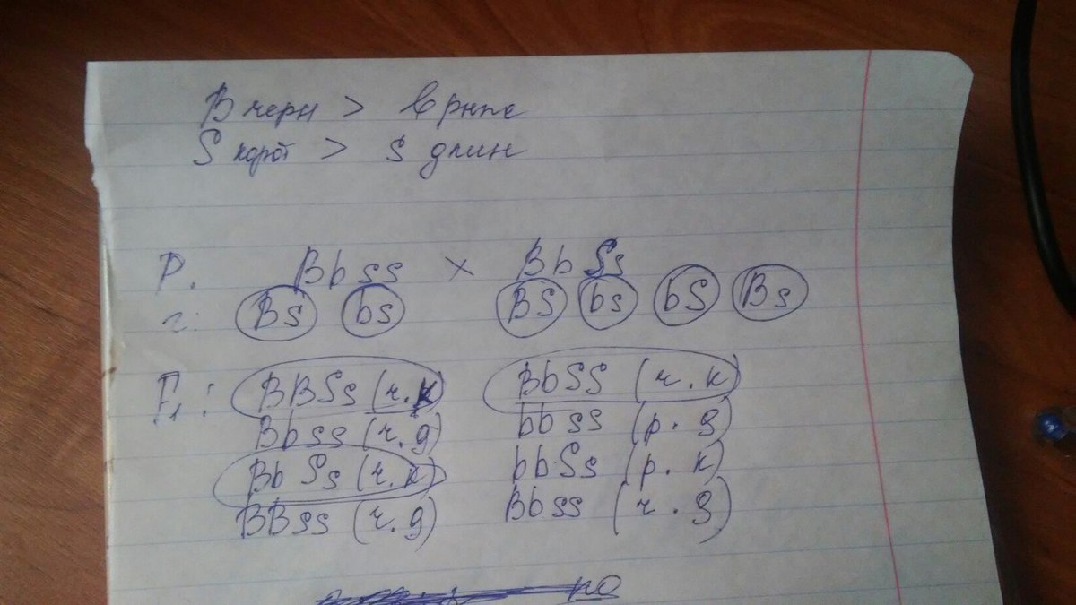 2. У кошек черный ген окраски шерсти (В) доминирует над геном рыжей окраски (b), а ген короткой шерсти (S) доминирует над геном длинной шерсти (s). Какова ожидаемая доля котят с черной короткой шерстью среди потомков, если кот будет иметь черную короткую шерсть (ВbSs), а кошка – черная с длинной шерстью (Bbss)?