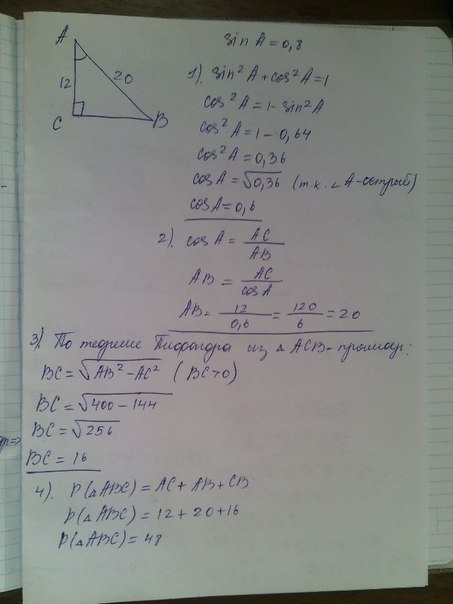 У трикутнику ABC кутС=90°, sinА=0,8,АС=12 см. Знайдіть периметр трикутника.