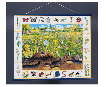 почва(полезные вещества, подземные воды, микроорганизмы) и солнце ⇒ растения ⇒ насекомые(опыляют растения для дальнейшего их развития,разрыхляют почву) ⇒ птицы(уничтожают вредителей) ⇒ животные(следят за балансом на лугу) ⇒ насекомые ⇒ микроорганизмы и т.д