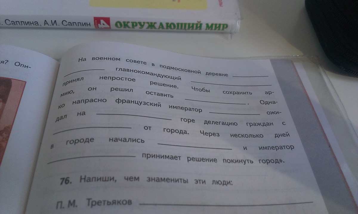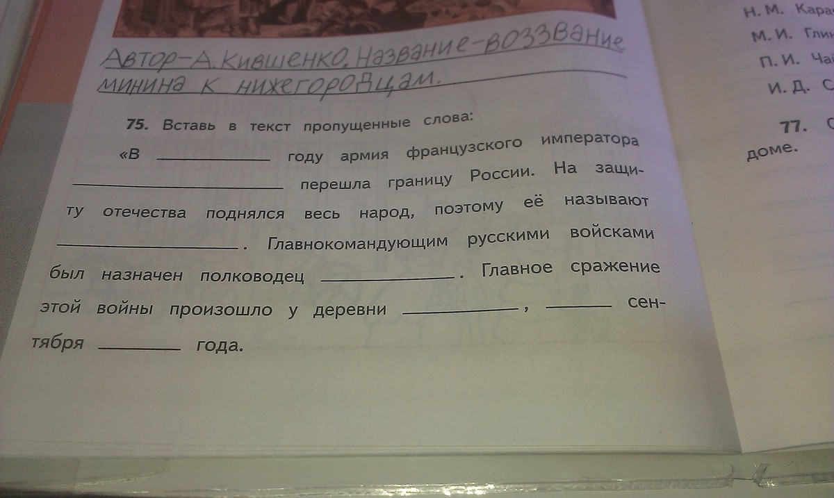 В 1812 году армия французского императора Наполеона Бонапарта перешла границу России. На защиту отечества поднялся весь народ, поэтому её называют Отечественной Войной. Главнокомандующим русскими войсками был назначен полководец Михаил Илларионович Кутузов. Главное сражение этой войны произошло у деревни Бородино ,17 сентября 1812 году.