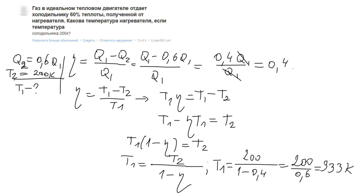 Газ в идеальном тепловом двигателе отдает холодильнику 60% теплоты, полученной от нагревателя. Какова температура нагревателя, если температура холодильника 200к?