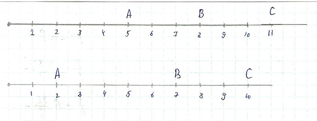 Помогите начертить числовой луч с единичным отрезком 1 см. Отметить на нём точки: А (5), В(8), С(11) и А(2), В(7), С(10).?