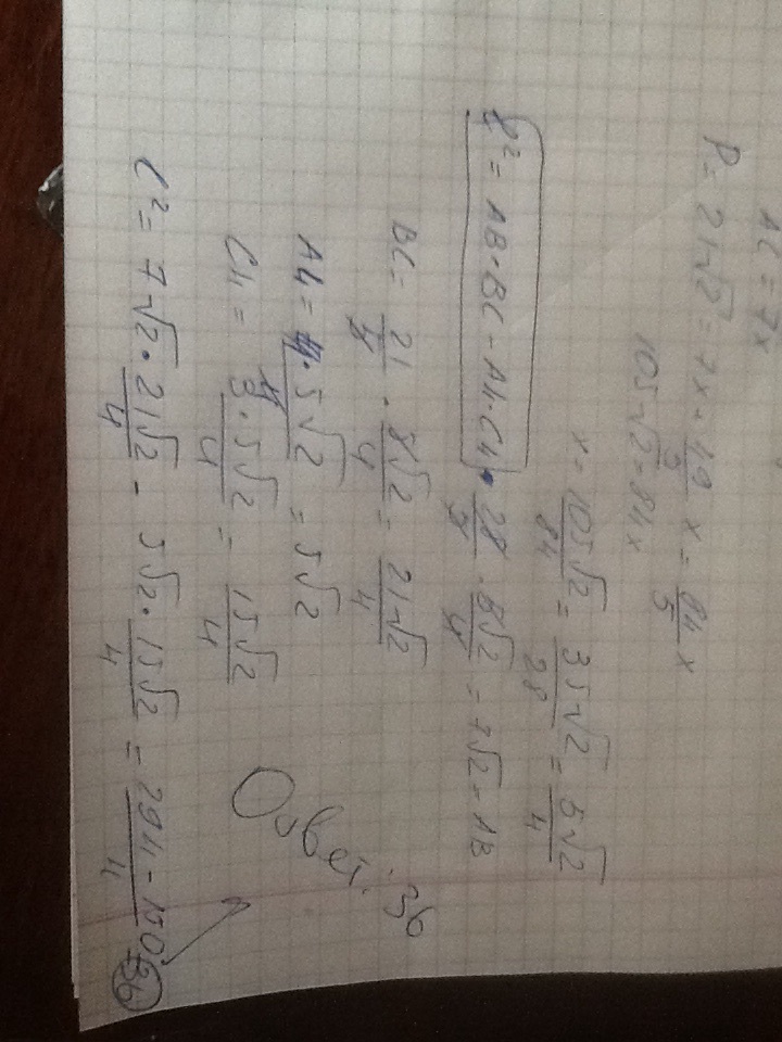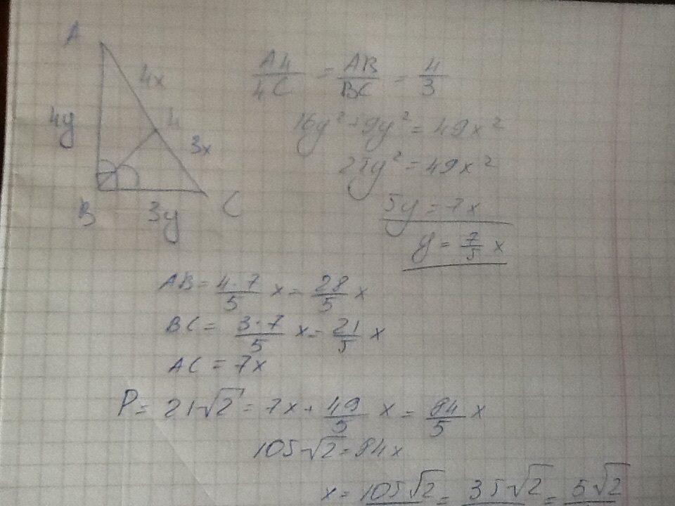 Биссектриса прямого угла прямоугольного треугольника делит гипотенузу в отношении 4:3 . Вычислите длину этой биссектрисы, если периметр треугольника равен 21√2