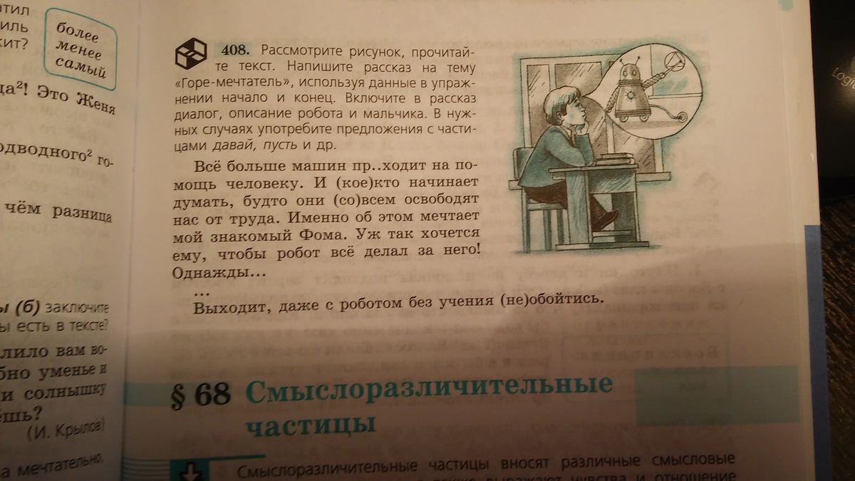 Однажды Фома решил, что больше не будет делать домашнее задание сам и купил робота. Покупка очень понравилась Фоме. Робот не только делал домашнее задание, но и убирался дома, поливал цветы и ухаживал за котом. Фома перестал слушать то, что ему говорят учителя на уроках, ведь робот все равно сделает идеальную домашнюю работу.