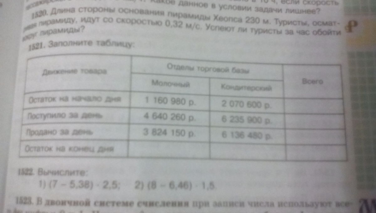 Табличка : Остаток на конец дня в молочном- (1160980+4640260)-3824150=1977090; Остаток на конец дня в кондитерском отделе- (2070600+6235900)-6136480=2170020. Всего:Остаток на начало дня 1160980+2070600=3231580. Поступило за день 4640260+6235900=10876160 Продано за день 3824150 + 6136480=9960630 Остаток на конец дня 1977090+2170020=4147110