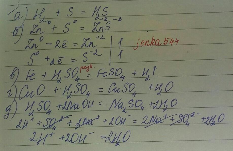 Составьте уравнения реакции взаимодействия: а) серы с водородом; б) серы с цинком ( укажите степени окисления элементов и расставьте коэффициенты методом электронного баланса); в) раствора серной кислоты с железом; г) раствора серной кислоты с оксидом меди (II); д)серной кислоты с раствором гидроксида натрия ( в молекулярной и ионной формах)