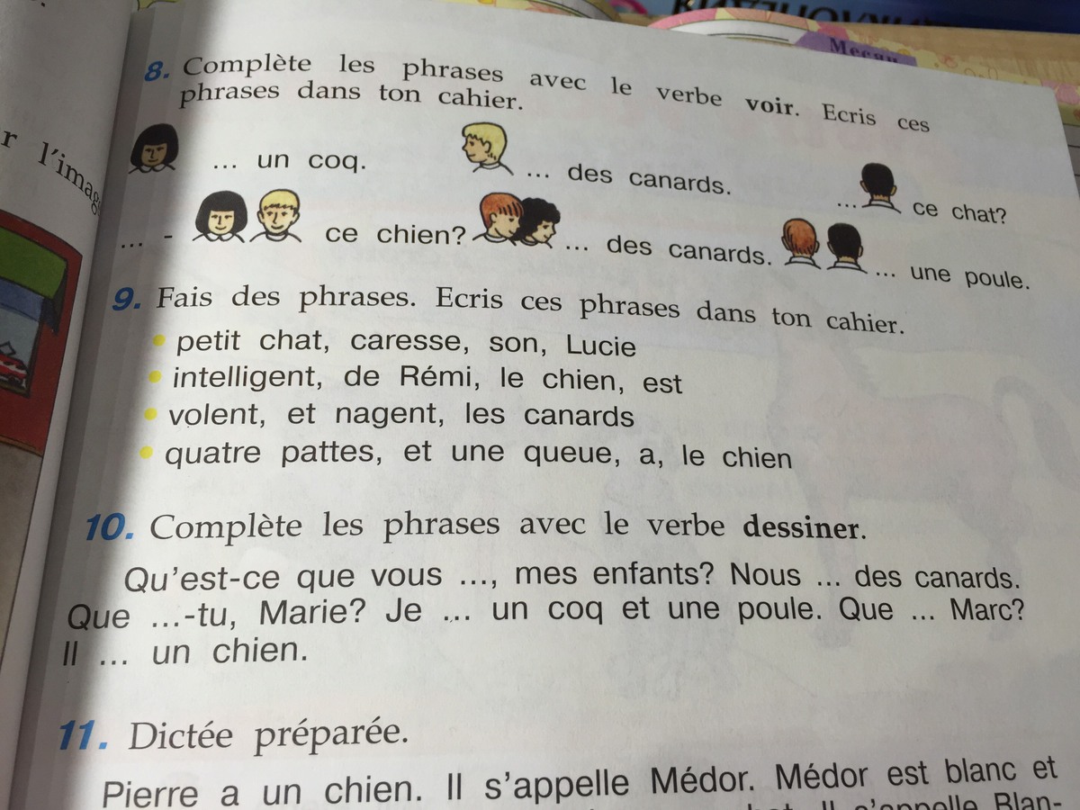 Lucie caresse son petit chat. Le chien de Remi est intelligent. Les canards volent et nagent. Le chien a quatre pattes et une queue. Упражнение 10. 1. Dessinez. 2. Dessinons. 3. Dessines. 4. Dessine 5. Dessine. 6. Dessine.