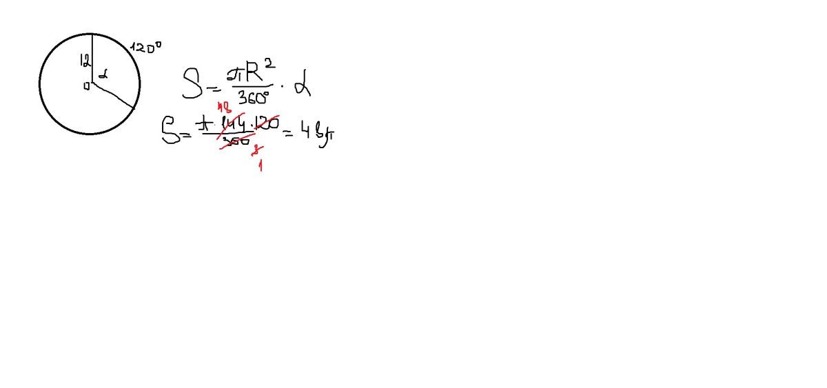 Найдите площадь кругового сектора,если градусная мера его дуги равно 120 градусов,а радиус круга равен 12 см. Пожалуйста с чертежом