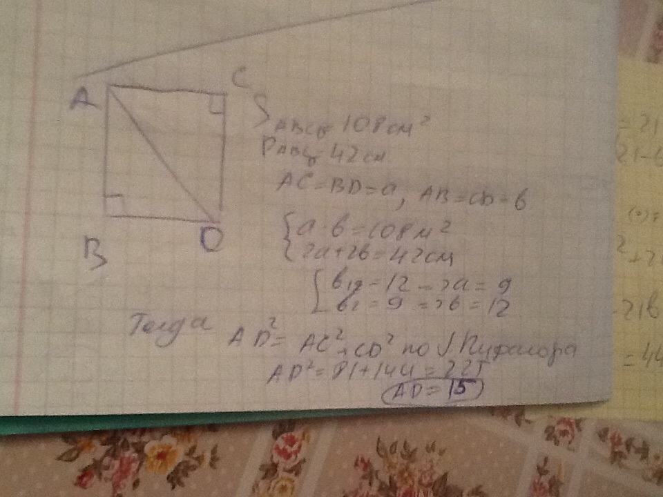 площадь прямоугольника равна 108 см в квадрате, а его периметр 42 см. Сколько см составляет диагональ данного прямоугольника?