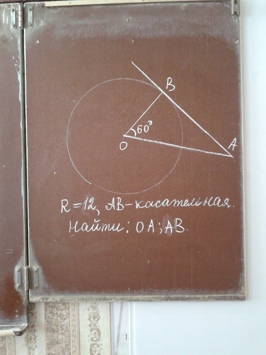 Радиус окружности, проведённый в точку касания перпендикулярен касательной, следовательно треугольник ОВА прямоугольный. Если в прямоугольном треугольнике один из острых углов=60 градусов, то другой острый угол (угол А) равен 90-60=30 градусов, значит АВ - гипотенуза прямоугольного треугольника будет в 2 раза больше катета, лежащего против угла в 30 градусов. АВ-12х2=24. АВ²=ОА²-ОВ² (по теореме Пифагора) АВ²=24²-12² АВ²=576-144 АВ²=432 АВ=12√3.