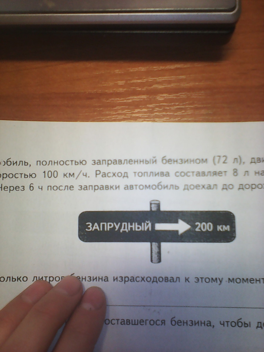 Если расход бензина 8 л на 100 км , а автомобиль движется со скоростью 100 км/час , то 72/8=9 часов езды хватит автомобилю , до указателя он ехал 6 часов , т.е, 6*8=48 литров он использовал , 72-48= 24 литра осталось
