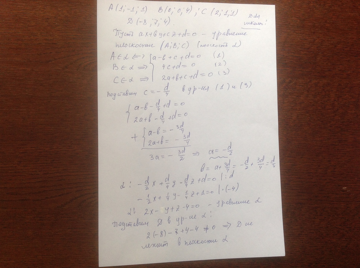 помогите решить) .. можно ли провести плоскости через четыре точки А (1; -1; 1), В (0; 0; 4), С (2; 1; 0), D (-8; 7; 4)