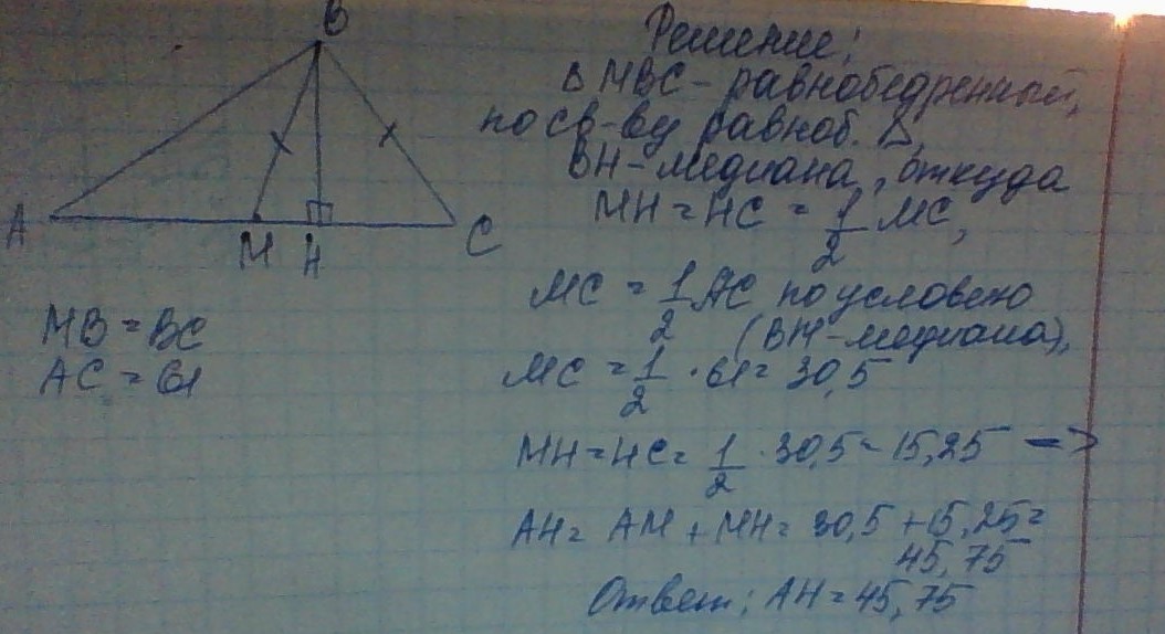типичная задачка ОГЭ,расписала подробно,требует знания определения медианы и св-ва равнобедренного треугольника.