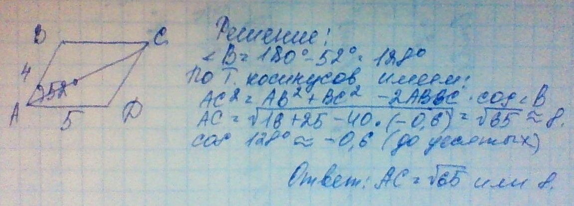 стороны параллелограмма 4 и 5 см ,острый угол равен 52 градусов. найти диагональ параллелограмма.соединяющую вершины острых углов.