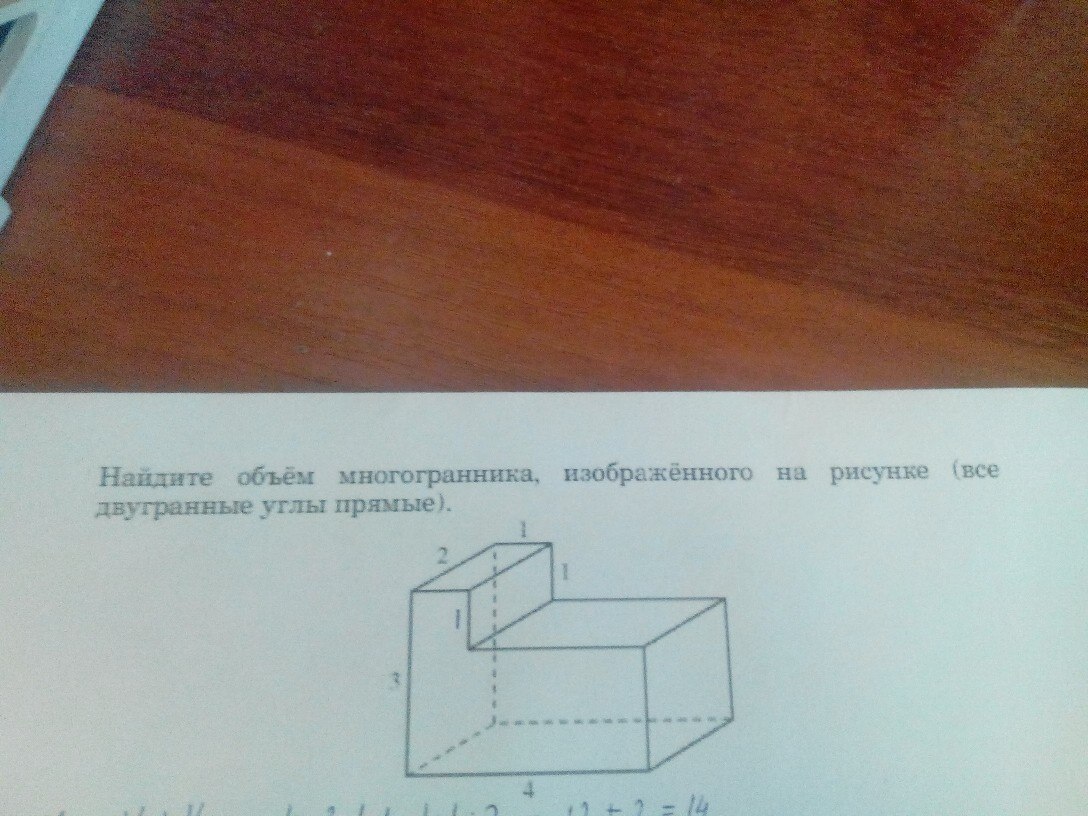 Можно найти иначе. Сначала найти объем части без верхнего выступа. Этот объем = 4*2*(3-1) = 4*2*2= 16. Объем верхнего выступа = 1*1*2 = 2. Полный объем = 16 +2 = 18.