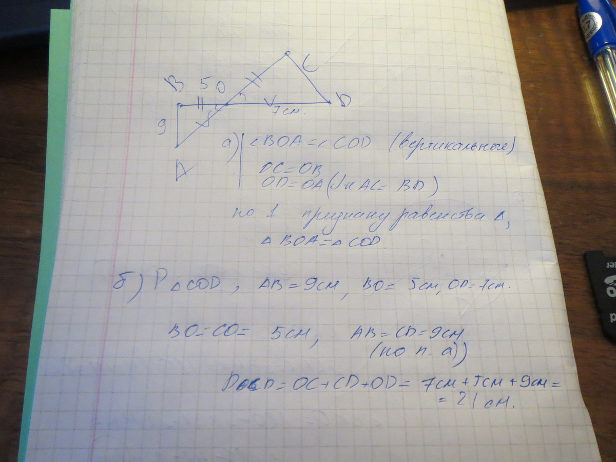 Отрезки АС и ВD пересекаются в точке О. ВD= АС, ОВ=ОС. а)Докажите, что ∆ АОВ = ∆ СОD; б)Найдите периметр ∆ СОD, если АВ=9см, ВО=5см, ОD=7см.