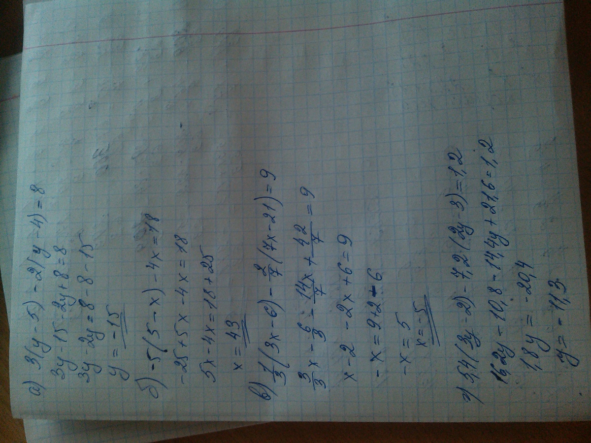 г) 5.4(3y-2)-7.2(2y-3)=1.2