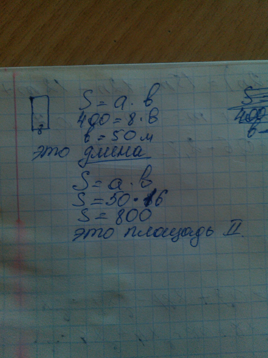 1). 400:8=50 (м) длина участка; 2).8*2=16 (м) ширина второго участка; 3). 16*50=800 (м/кв) площадь второго участка.