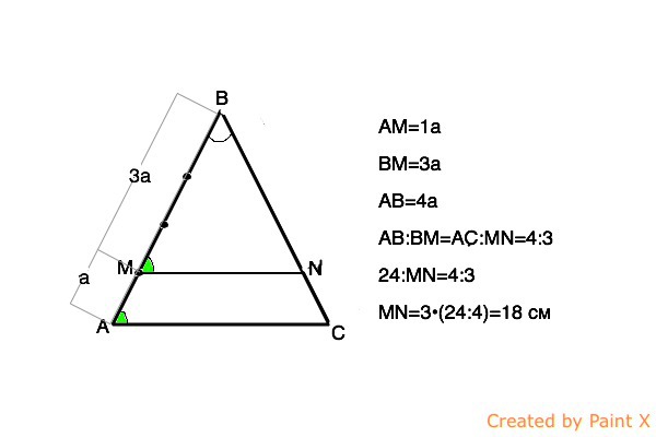 Площина а перетинає сторони АВ і ВС трикутника ABC в точках М і N відповідно і паралельна стороні AС. Знайти довжину відрізка MN, якщо АС = 24 см, а ВМ: AM = 3:1.