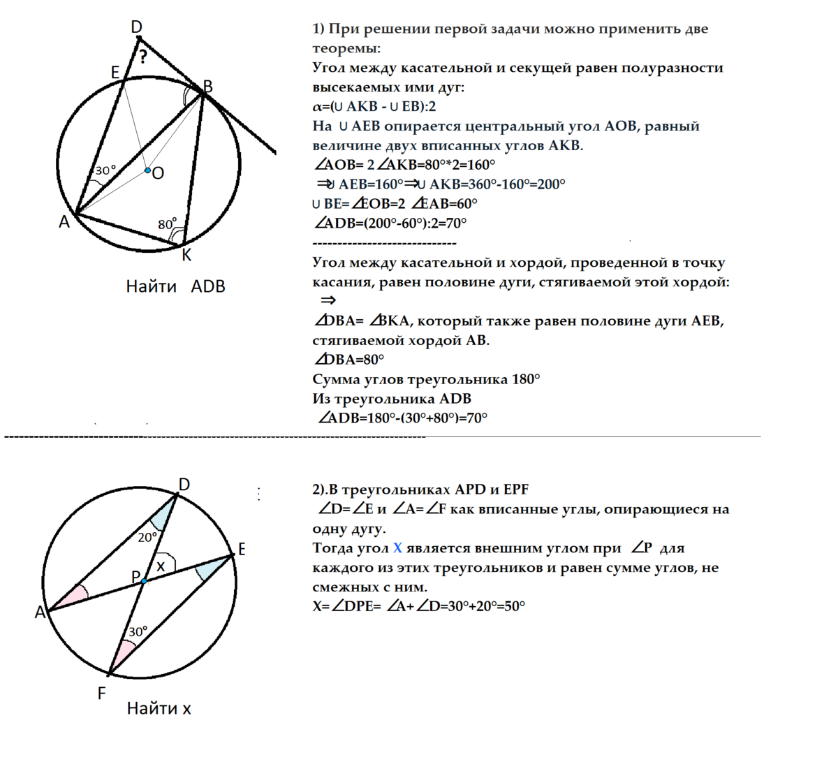 ∠DBА= ∠ВКА, который также равен половине дуги АЕВ, стягиваемой хордой АВ. ∠DBА=80°