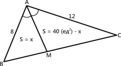 В треугольнике АВС проведена биссектриса АМ. Найдите площадь треугольника АВМ, если площадь треугольника АВС равна 40, AB=8, AC=12