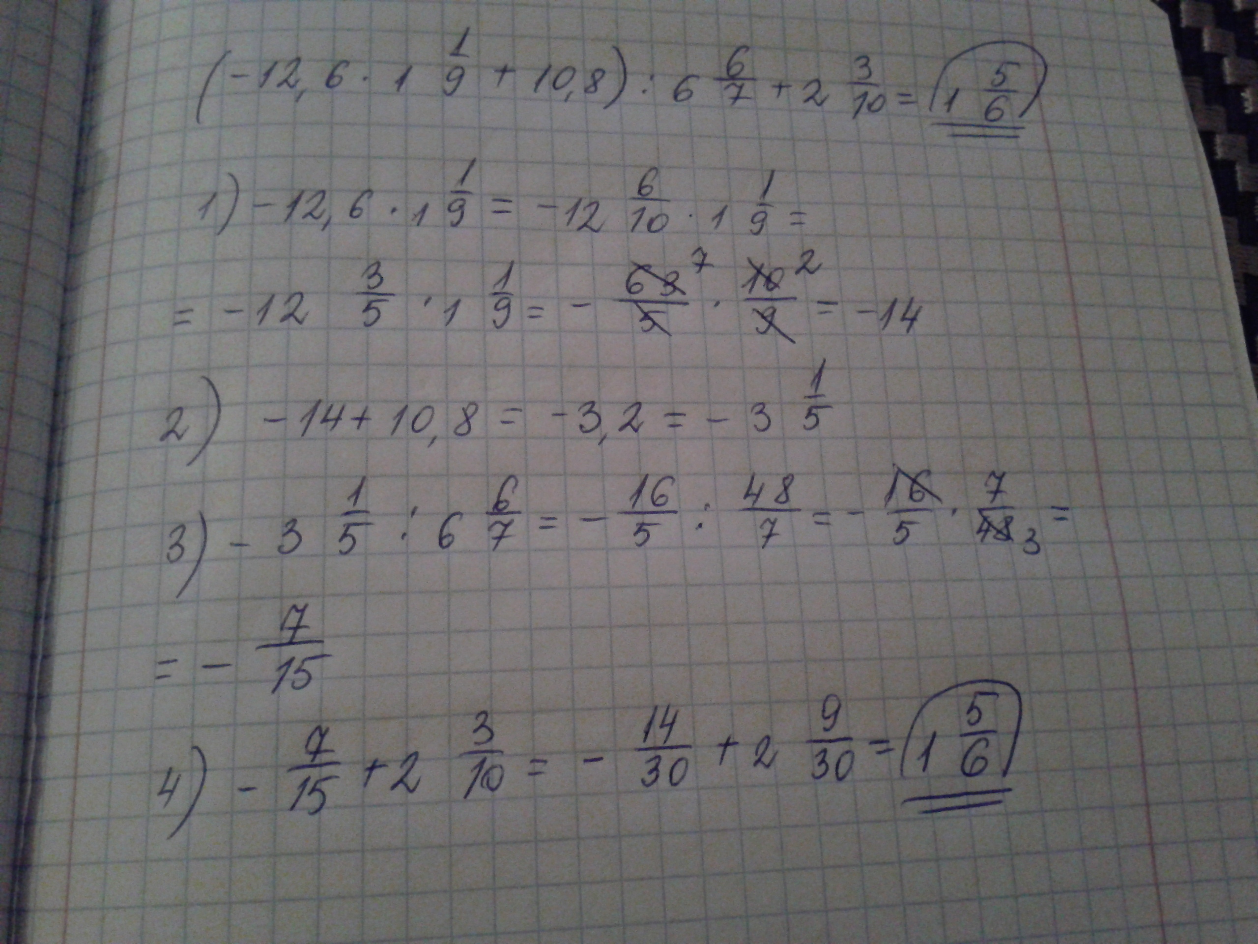 (-12,6 * 1 ¹/₉ + 10,8) : 6 ⁶/₇ + 2 ³/₁₀ = 1 ⁵/₆