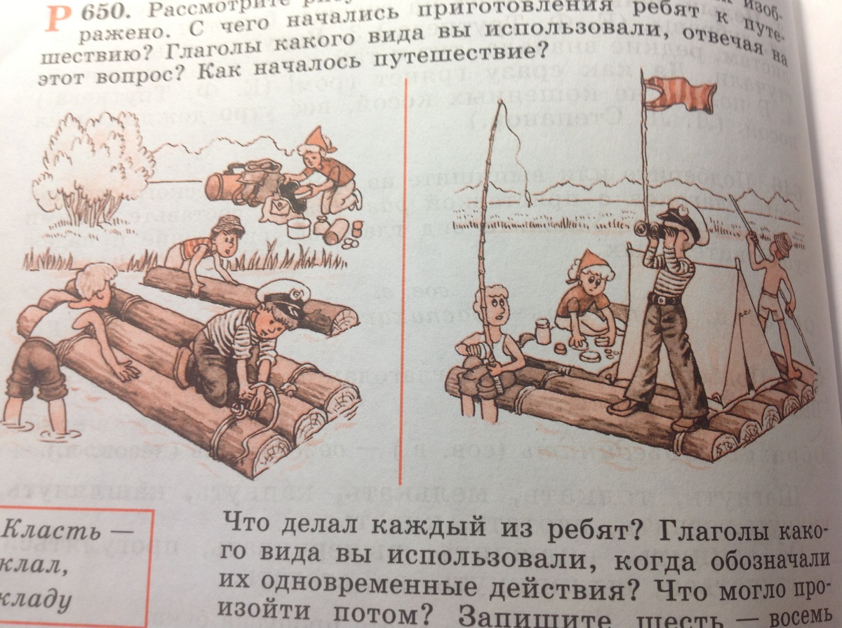 Когда всё было готово, они отправились (2 скл). Капитан был главным на пледе, он смотрел (2 скл) в бинокль, чтобы видеть (2 скл) сколько им ещё нужно проделать (1 скл) пути. Другой мальчик грёб (1 скл) веслом. А третий мальчик, наблюдая (1 скл) за действиями капитана, ловил (2 скл) рыбку. Девочка же готовила (2 скл) небольшой пикничок прям на пледе.