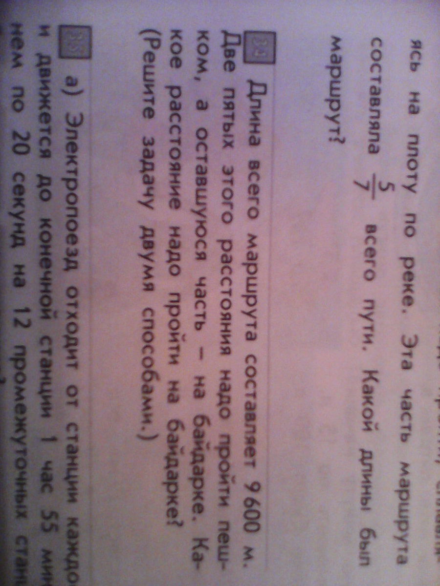 длина всего маршрута составляет 9 600 метров. Две пятых этого расстояния надо пройти пешком оставшуюся часть на байдарке. какое расстояние надо пройти на байдарке? (решите задачу двумя способами)