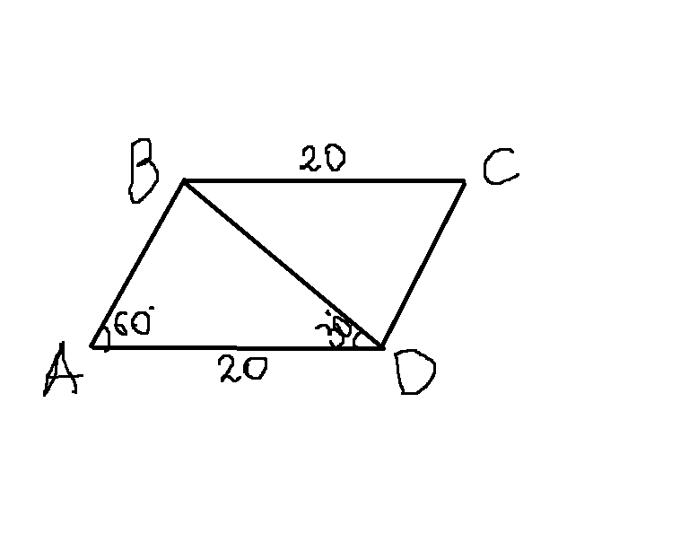 острый угол параллелограмма равен 60 градусов меньшая диагональ наклонена к большей стороне под углом 30 градусов найти площадь параллелогррамма если большая его сторона равна 20