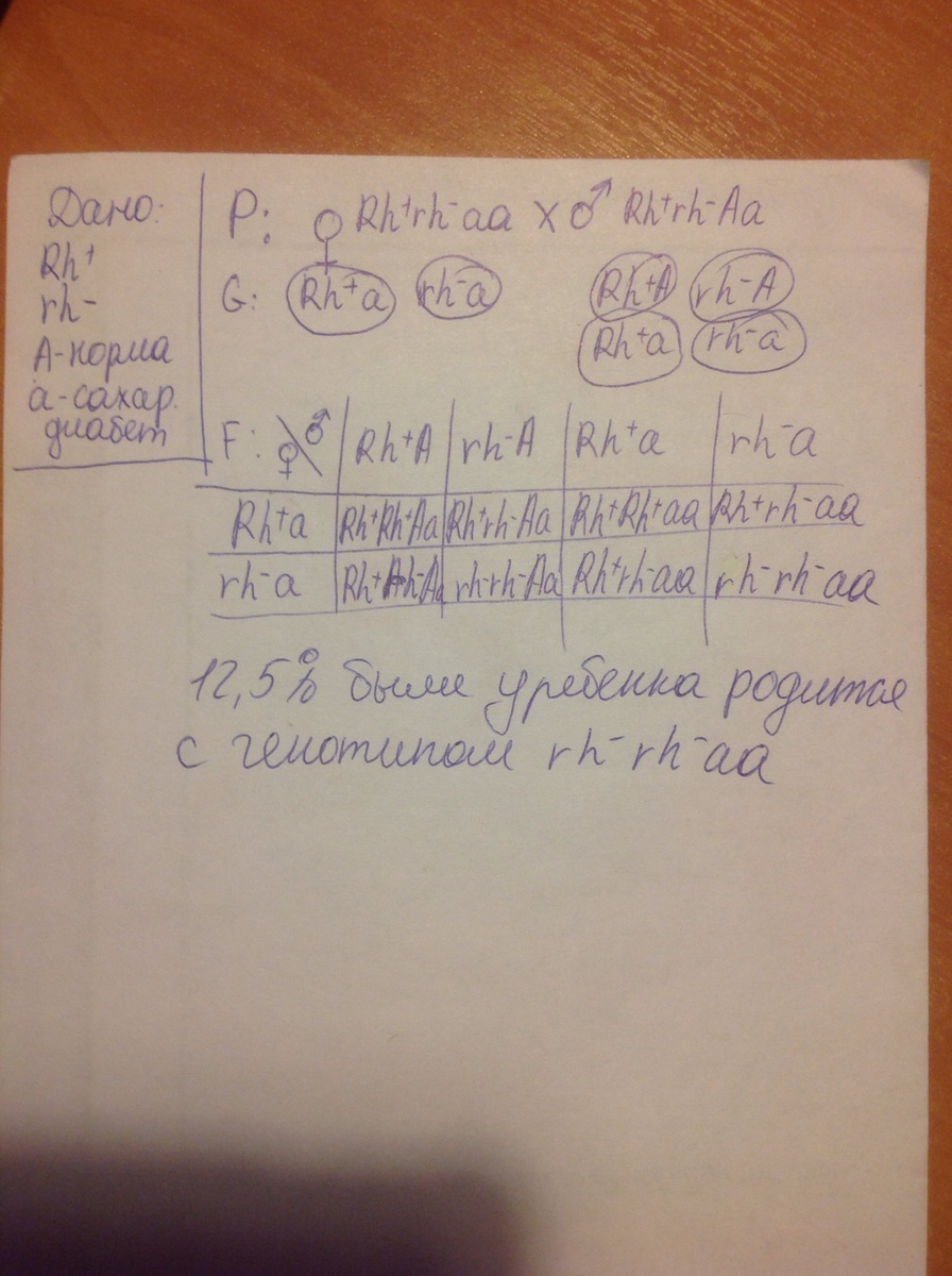 Какие шансы были у ребенка появиться именно таким, если учесть,что ген резус-положительности-доминантный,как и ген,контролирующий нормальный углеводный обмен.(на листочке,с объяснение).Огромное спасибо!