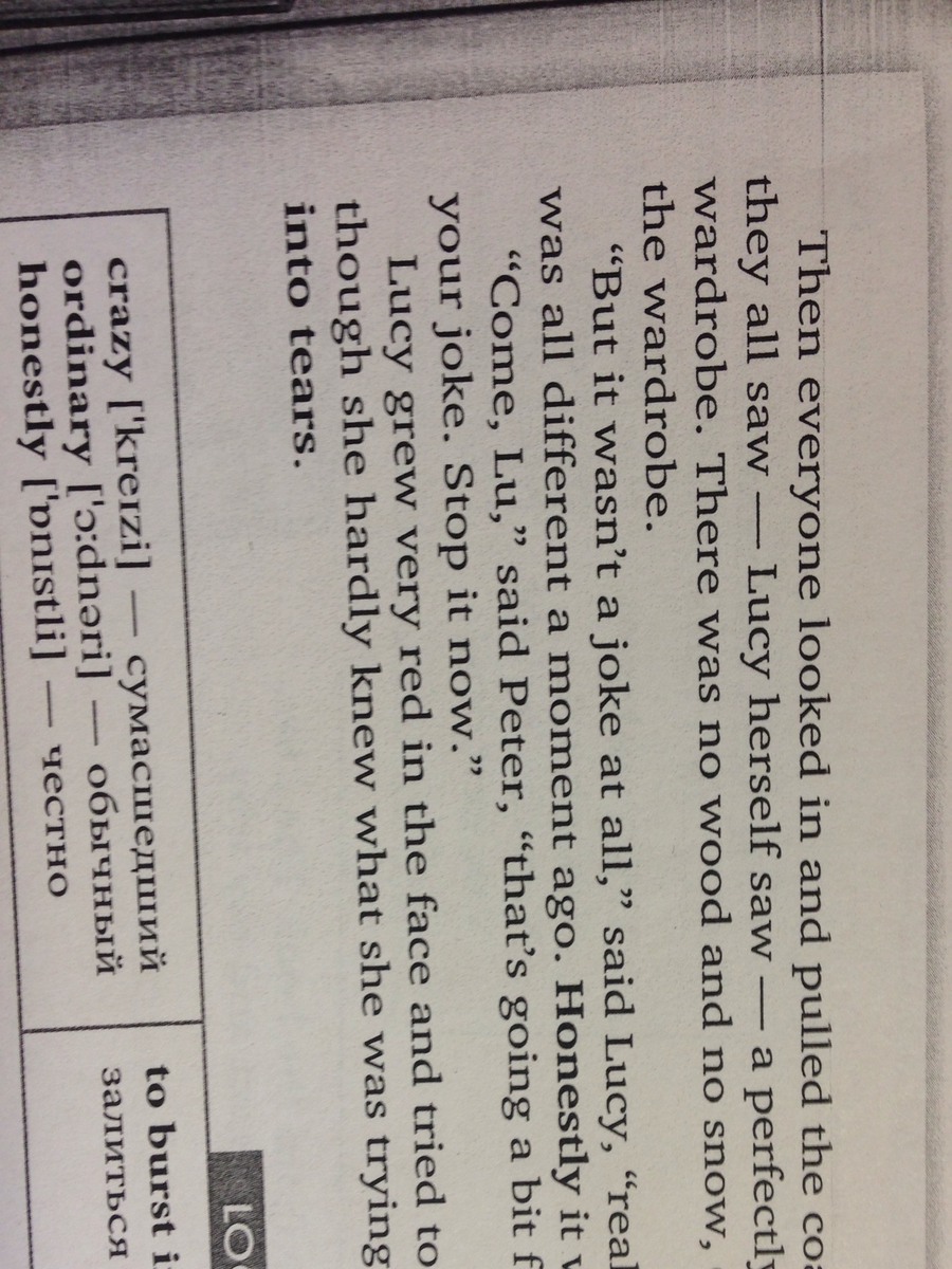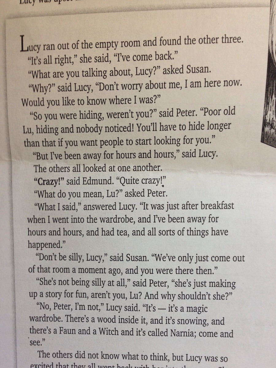 "Нет, Питер, я не выдумываю." - сказала Люси. "Это магический гардероб. Там еть снег, и Фаун, и ведьма и это все называется Нарнией. Пойдем и ты сам все увидишь"
