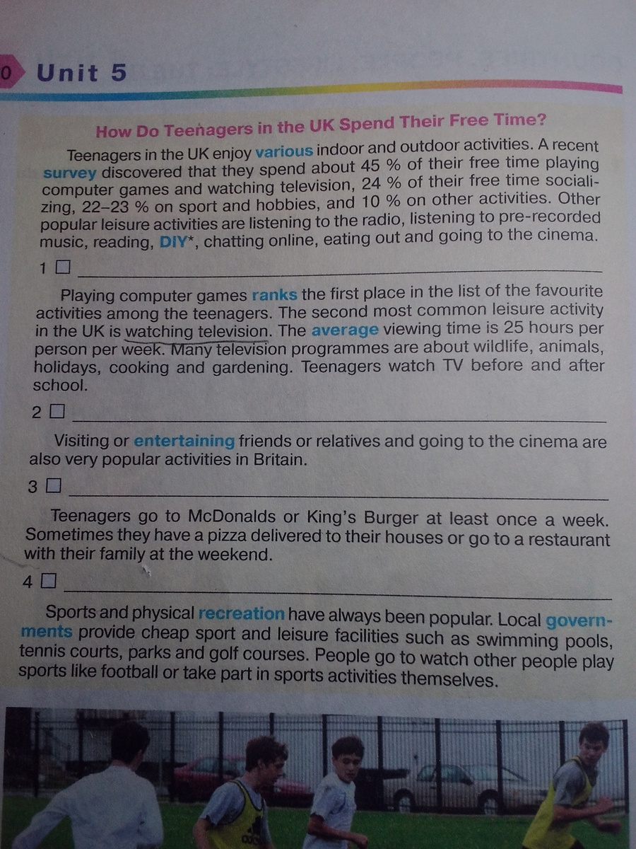Подростки Великобритании увлекаются разными видами деятельности: вне помещения и внутри. Недавний опрос показал, что они проводят около 45% свободного времени играя в компьютерные игры и смотря телевизор, 24% общаясь, 22-23% занимаясь спортом и хобби и 10% другим. Другой популярный досуг это слушать радио, заранее записанную музыку, читать, делать что-то своими руками, переписываться в сети, есть, ходить в кино.