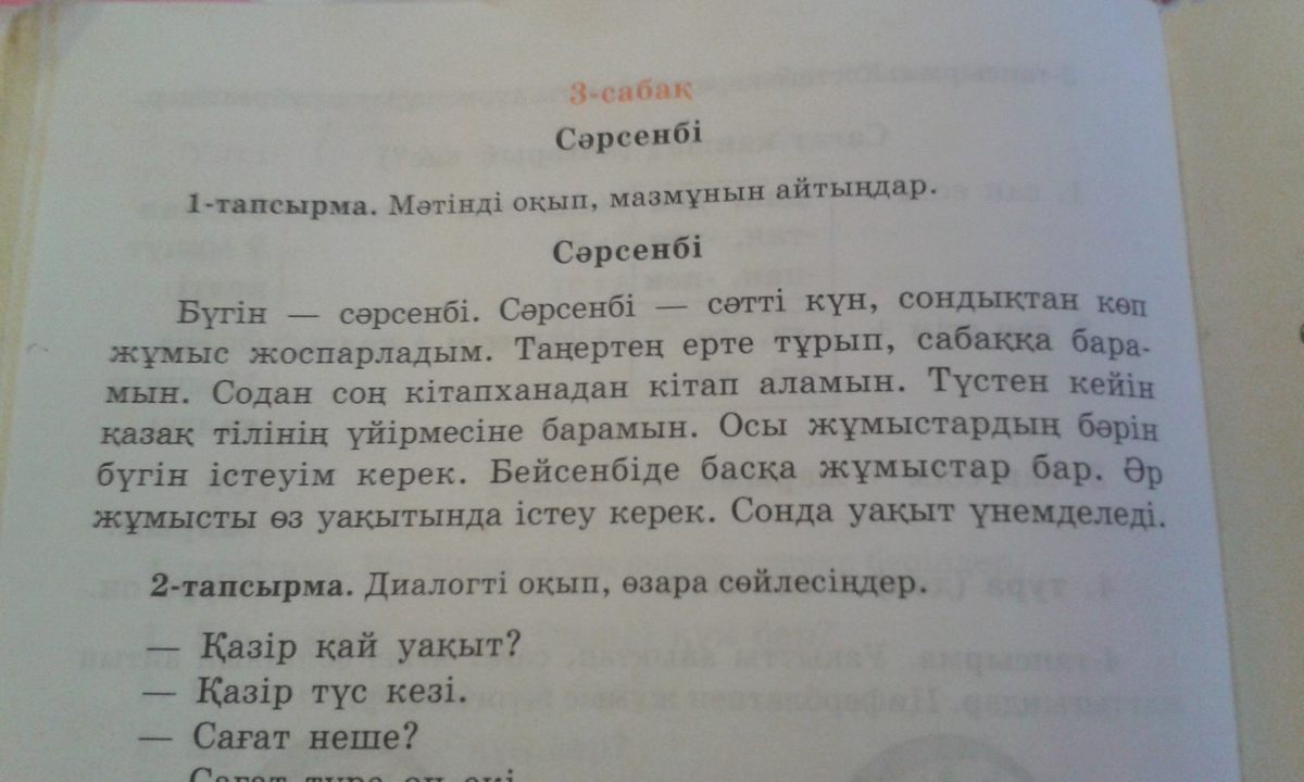 сегодня-среда.Среда удачный день, поэтому запланировал много дел.Утром рано встану и пойду в школу.Потом возьму книгу с библиотеки.После обеда пойду на кружок казахского языка.Все эти дела должен сделать сегодня.В четверг есть другие дела.каждое дело надо делать в своё время.тогда время не зря будет потрачено.