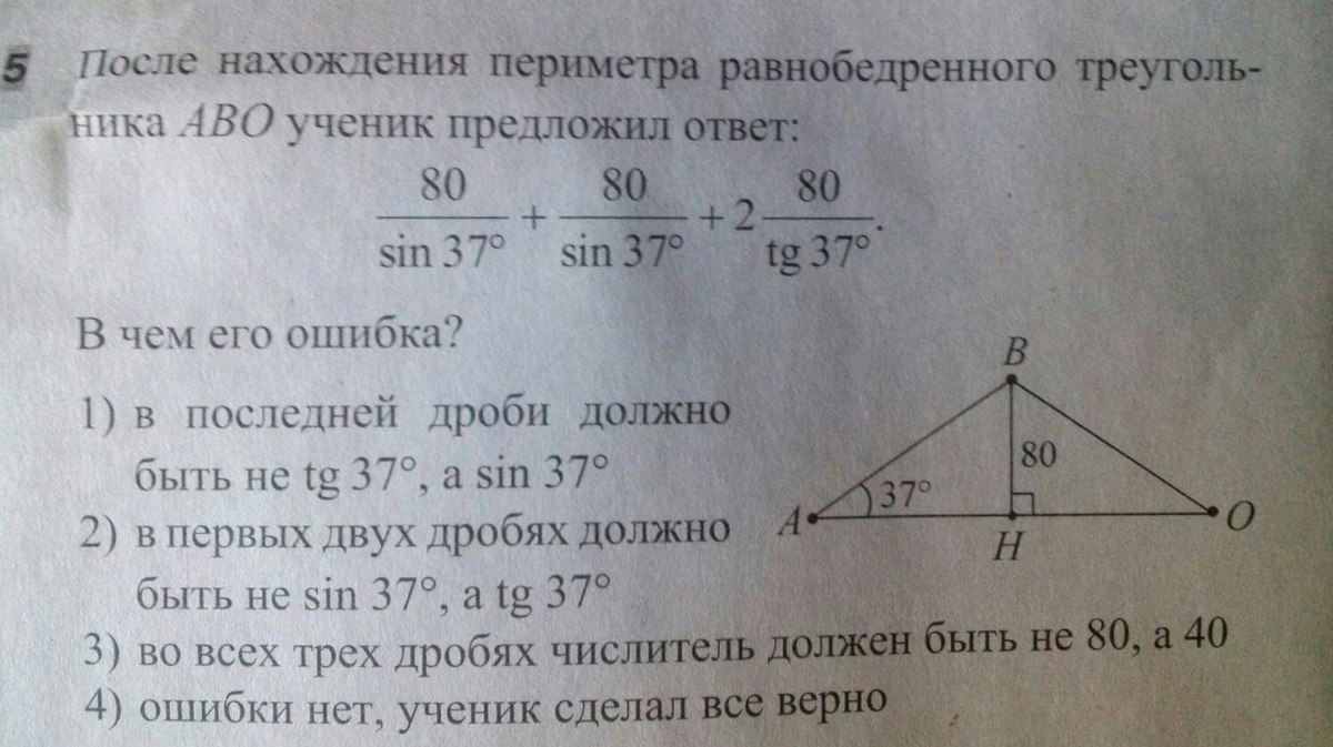 После нахождения периметра равнобедренного треугольника ABO ученик предложил ответ: