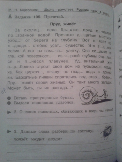 За околицей села блестит пруд с чистой прозрачной водой. Прочные дощатые мостки уходят от берега на глубину. Вот ползет по подводному стеблю усатое существо. Это водяной ослик. А вот ты замечаешь улитку. Она скользит по гладкой поверхности. Из черной глубины отделился и понесся плывунец. Удивительный паук серебрянка строит свой дом из пузырьков воздуха. Как циркачи пляшут по глади воды водомерки. Бархатные пиявки спрятались под старым бревном. Пруд живет своей жизнью. Он таит много загадок. Может быть, ты их разгадаешь?