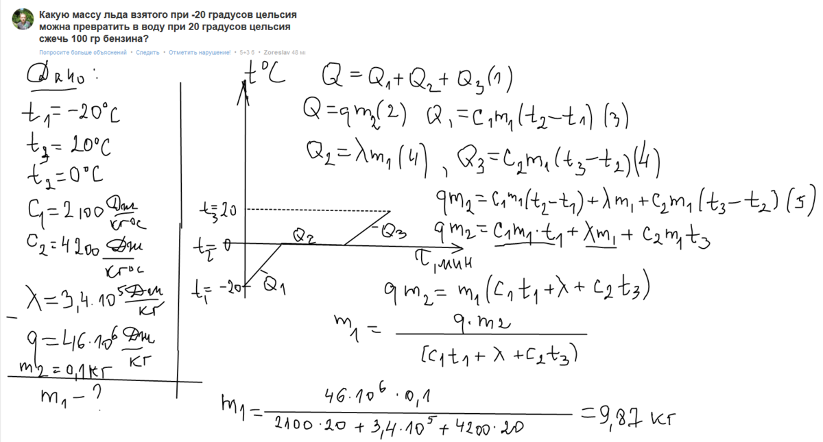 Какую массу льда взятого при -20 градусов цельсия можна превратить в воду при 20 градусов цельсия спалив 100 гр бензина?