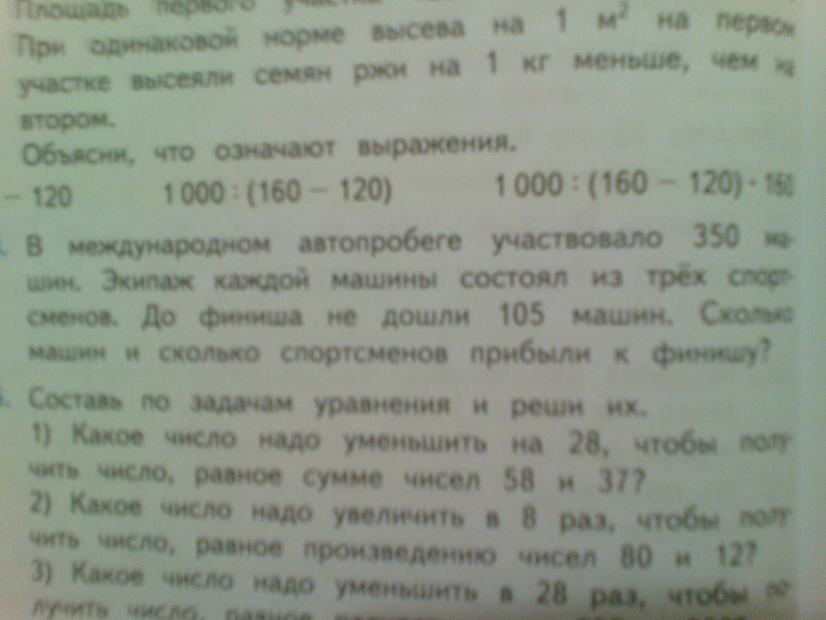 в Международном автопробеге учавстволо 350машин. экипаж каждой машины состоял из трёх спортсменов. до Финиша не дошли 105 машин. Сколько машин и сколько спортсменов прибыли к финишу.