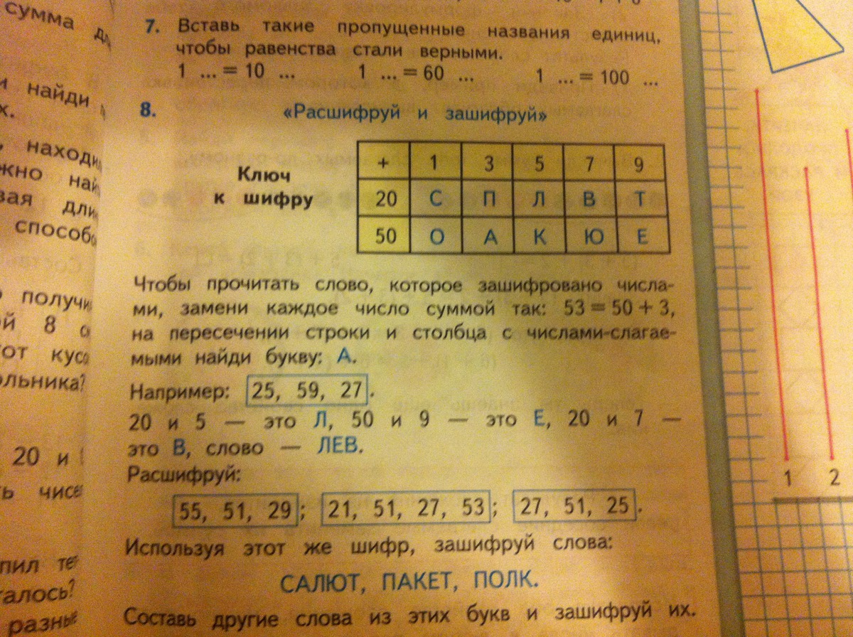 Зашифруй: 21, 53, 25, 57, 29; 23, 53, 55, 59, 29; 23, 51, 25, 55.