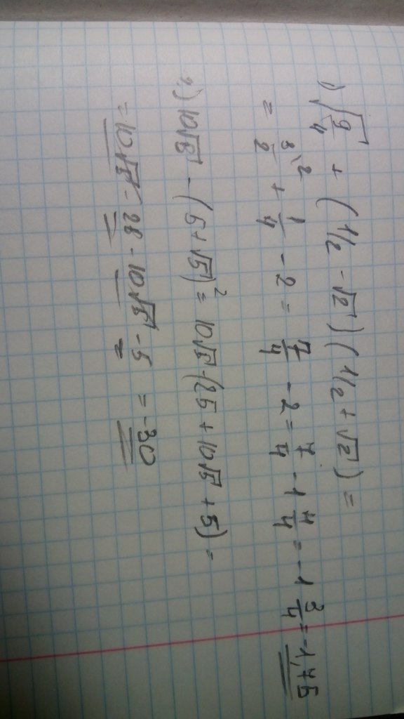 рішіт пожалуста срочнооо рішіт пожалуста срочнооо рішіт пожалуста срочнооо :)) 1 ) √(9/4)+ (1/2- √2)(1/2+ √2) 2) 10√5- (5+ √5)2
