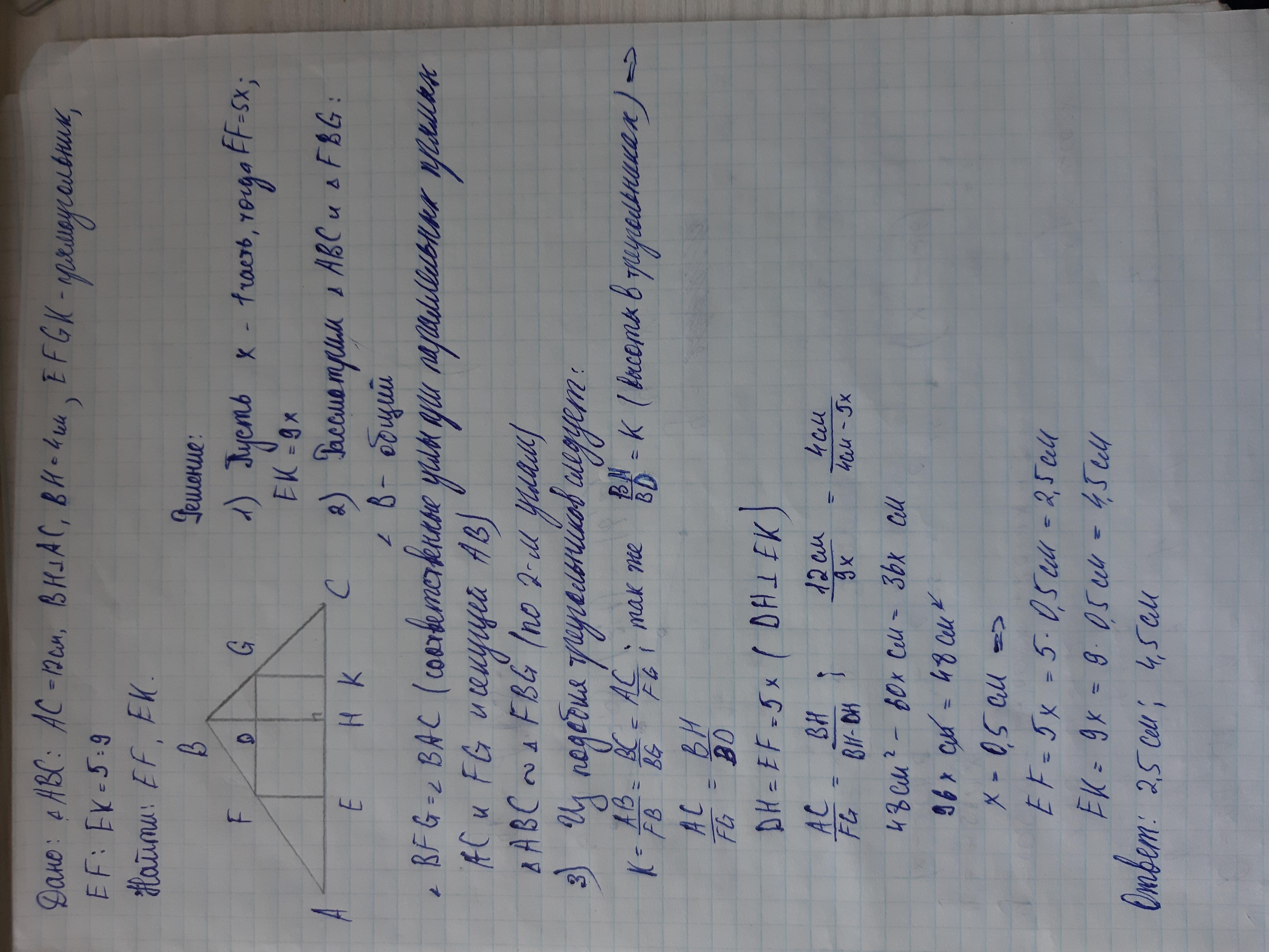 В треугольник с основанием 12 см и высотой 4 см вписан прямоугольник, стороны которого относятся как 5:9, причем большая сторона принадлежит основанию треугольника. Найти стороны прямоугольника. Помогите,пожалуйста!!! Буду очень благодарен!!!