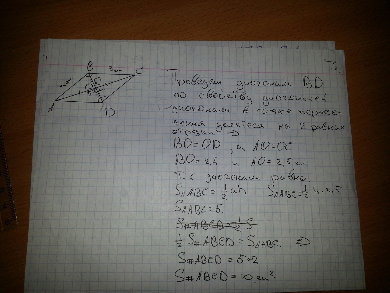 диагонали одинаковые и равны 5 см, следовательно паралелограм у нас прямоугольный треугольник, площадь прямоугольника равна S=a*b=3*4=12 см²