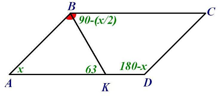 Если угол А=С=х, то В=D=180-x. Тогда так как ВК - биссектриса угла В, то