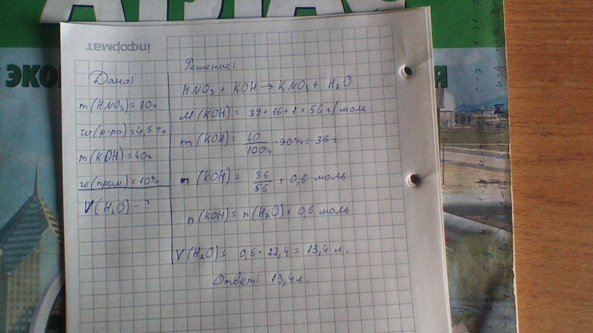 Для полной нейтрализации 80г 4,5%-ного раствора азотной кислоты потребовалось 40 г раствора гидроксида калия, содержащего 10% примесей. Найти объем воды.