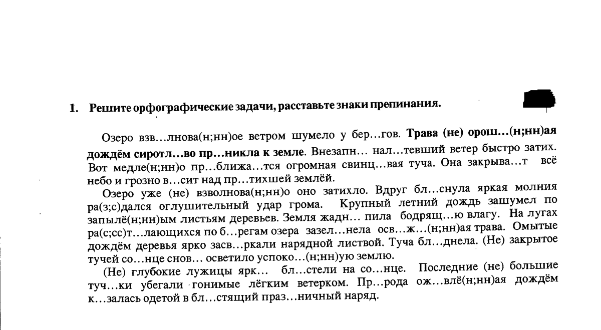 Озеро, взволнованное ветром, шумело у берегов. Трава, не орошённая дождём, сиротливо приникла к земле. Внезапно налетевший ветер быстро затих. Вот медленно приближается огромная свинцовая туча. Она закрывает всё небо и грозно висит над притихшей землёй. Озеро уже не взволновано, оно затихло. Вдруг блеснула яркая молния, раздался оглушительный удар грома. Крупный летний дождь зашумел по запылённым листьям деревьев. Земля жадно пила бодрящую влагу. На лугах, расстилающихся по берегам озера, зазеленела освежённая трава. Омытые дождём деревья ярко засверкали нарядной листвой. Туча бледнела. Не закрытое тучей солнце снова осветило успокоенную землю. Неглубокие лужицы ярко блестели на солнце. Последние небольшие тучки убегали, гонимые лёгким ветерком. Природа, оживлённая дождём, казалась одетой в блестящий праздничный наряд.