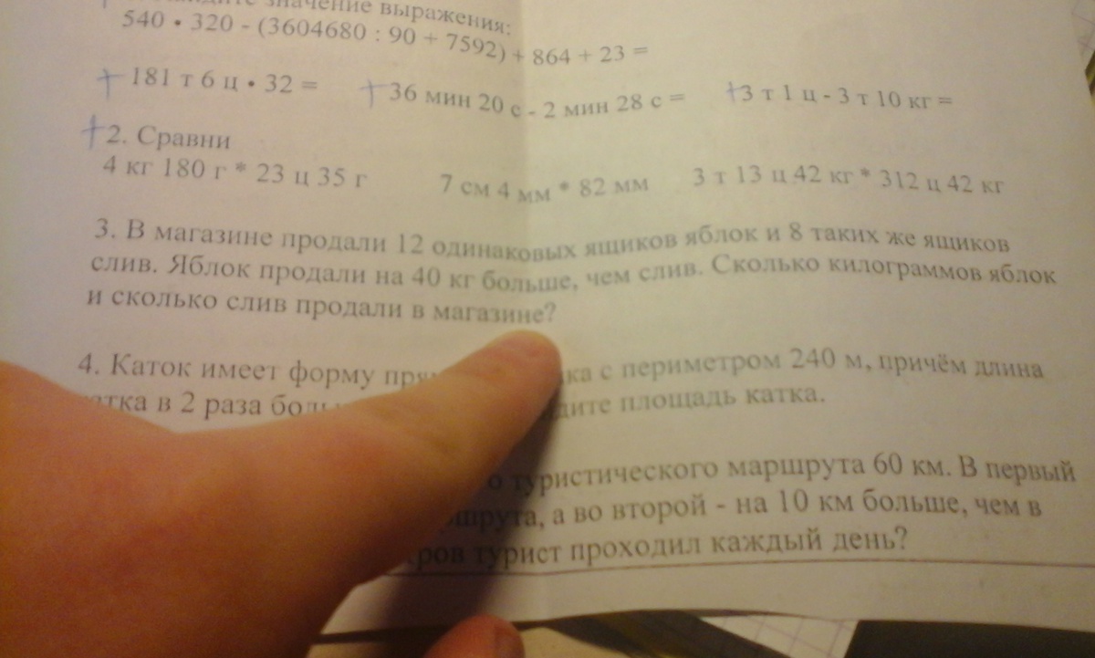 В магазине продали 12 одинаковых ящиков яблок и 8 таких же ящиков слив. Яблок продали на 40 кг больше,чем слив. Сколько килограммов яблок и сколько слиы продали в магазине?